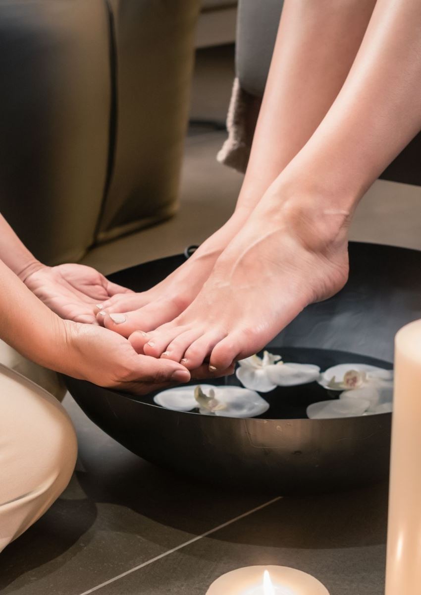 Warm herbal foot soak to soften skin and relax muscles